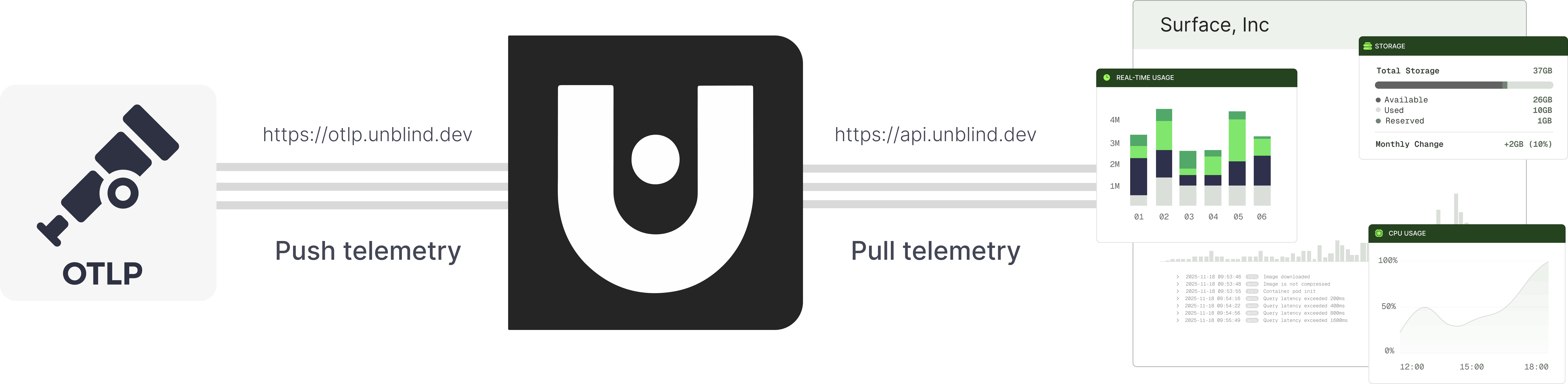 Unblind helps you build native observability and monitoring dashboards right into your SaaS product. Keep your existing observability pipeline and just send us the metrics and logs your customers need to see. No third-party tools, no complicated handoffs. Just monitoring that feels like a natural part of your product.